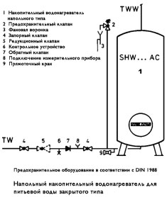Каждый закрытый (напорный) накопительный водонагреватель должен быть снабжен по меньшей мере одним мембранным предохранительным клапаном. В водонагревателях с номинальной емкостью до 5000 л могут применяться только подпружиненные мембранные предохранительные клапана (см.DIN 4753, часть 1).